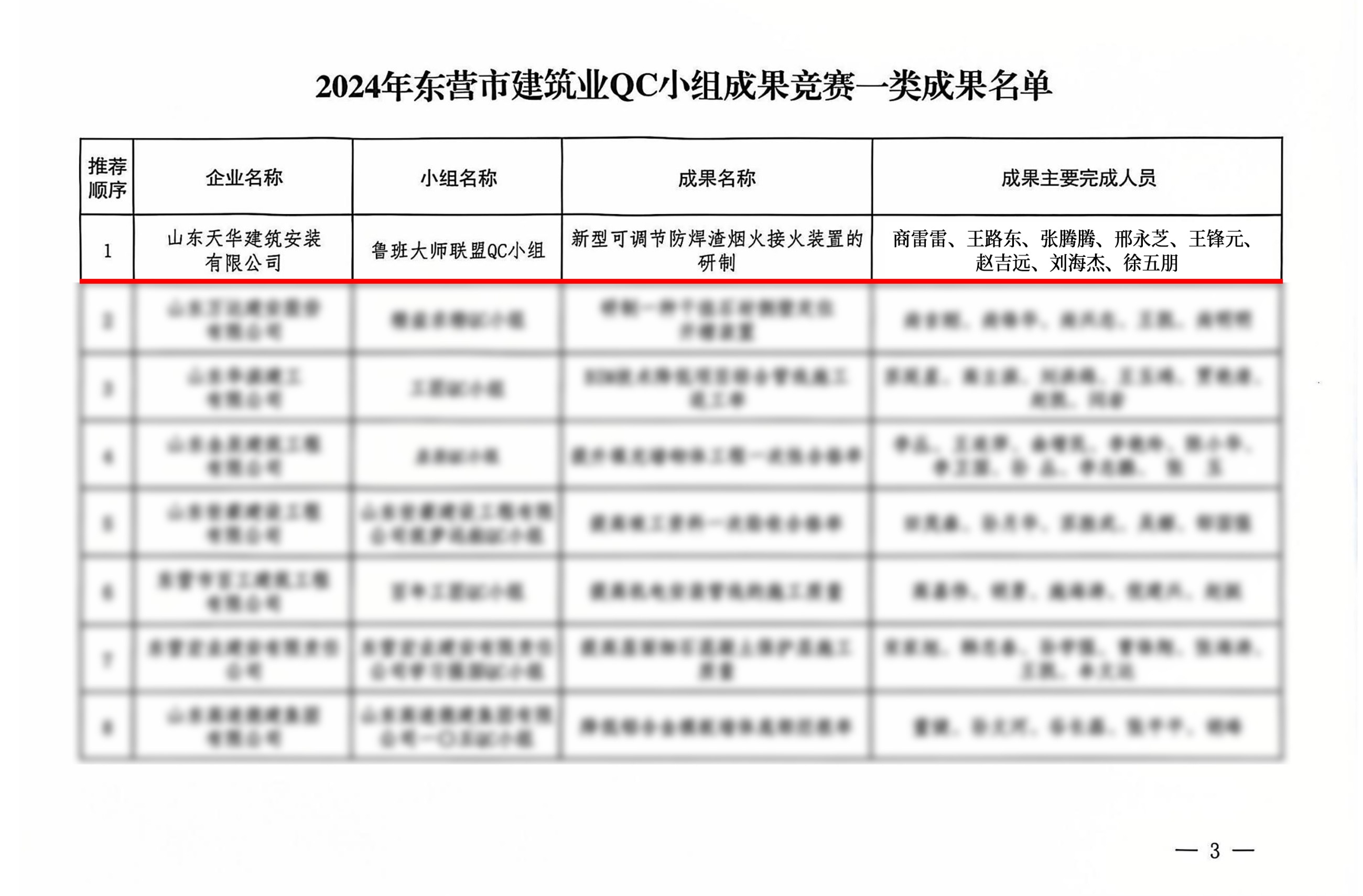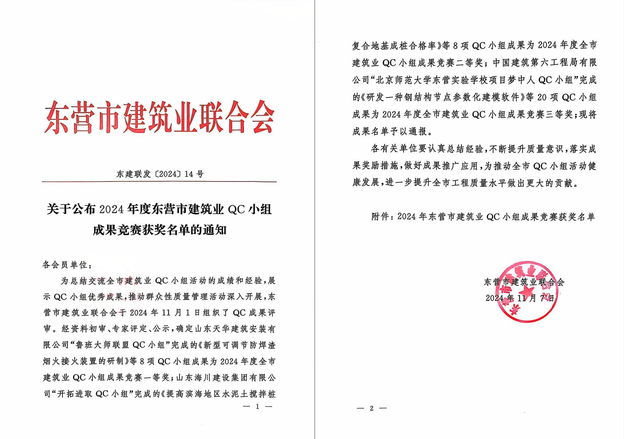 近日,東營市建筑業(yè)聯(lián)合會印發(fā)《關(guān)于公布2024年度東營市建筑業(yè)QC小組成果競賽獲獎成果的通知》,天華實業(yè)集團QC小組完成的“新型可調(diào)節(jié)防焊渣煙火接火裝置的研制”“提高低溫熱輻射采暖系統(tǒng)施工一次驗收合格率”兩項成果分別榮獲競賽一、二等獎。