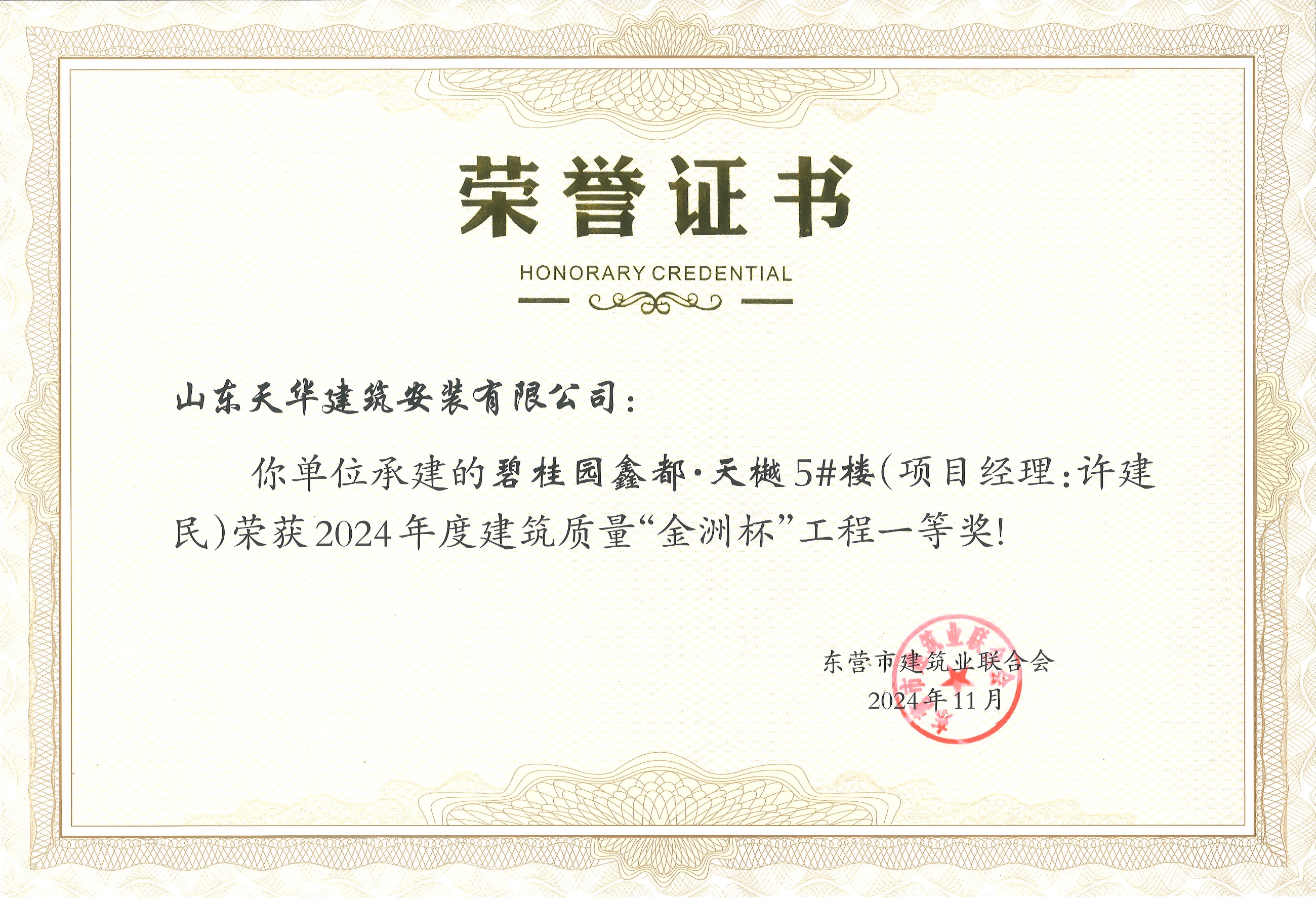 近日,東營市建筑業(yè)聯(lián)合會公布了《關(guān)于2024年度建筑和裝飾裝修質(zhì)量“金洲杯”工程競賽評選結(jié)果的通報》,天華實業(yè)集團(tuán)承建的碧桂園鑫都·天樾5#樓榮獲“金洲杯”工程競賽一等獎;碧桂園鑫都·天樾1#、3#、7#、8#樓榮獲“金洲杯”工程競賽三等獎。