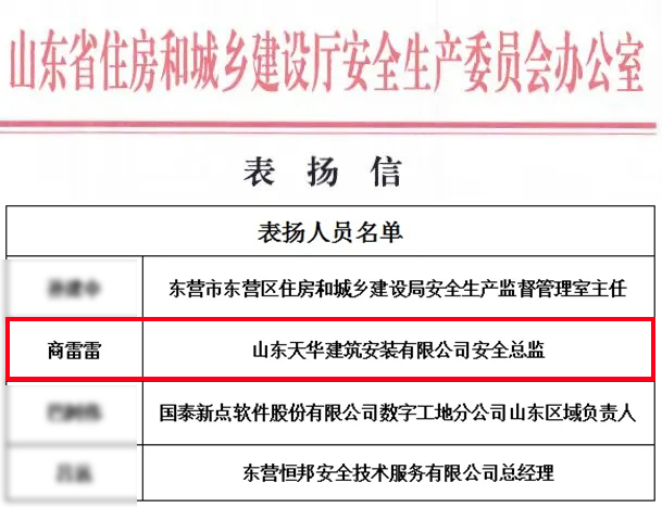 近日,天華實業(yè)集團(tuán)收到來自山東省住房和城鄉(xiāng)建設(shè)廳的表揚信,對參與編制《房屋市政工程重大事故隱患執(zhí)法檢查重點事項清單》《房屋市政工程施工企業(yè)重大事故隱患重點排查清單》(簡稱“兩個清單”)工作的安全總監(jiān)商雷雷的職業(yè)素養(yǎng)與業(yè)務(wù)能力給予了高度評價和衷心感謝。