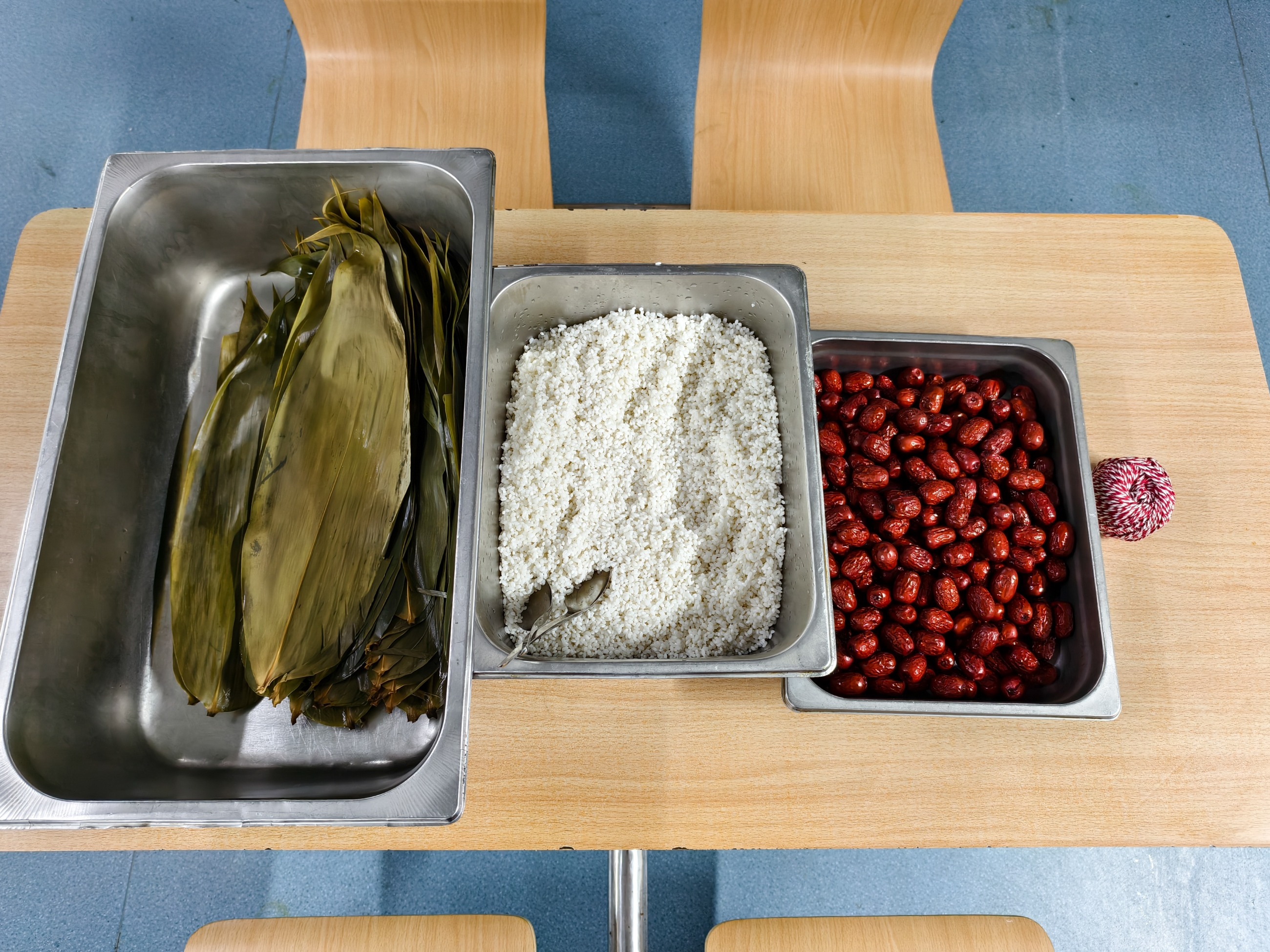 在集團公司活動現(xiàn)場,工作人員提前準(zhǔn)備好了粽葉、糯米、紅棗以及包粽子所必需的盆、盤子、棉線、勺子等物品。